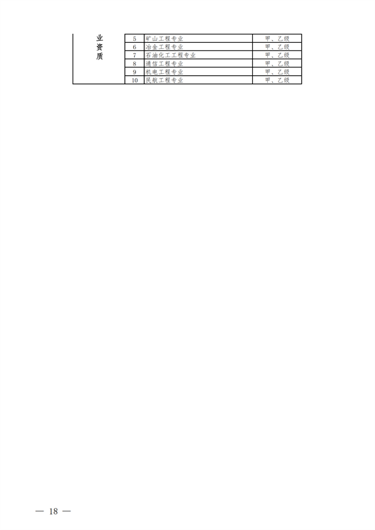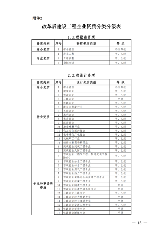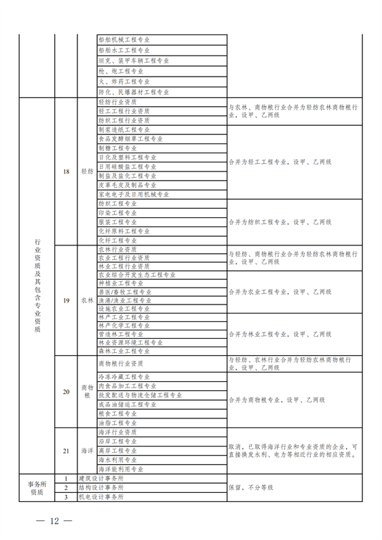 2.工程設(shè)計(jì)資質(zhì)。保留綜合資質(zhì);將21類行業(yè)資質(zhì)整合為14類行業(yè)資質(zhì);將151類專業(yè)資質(zhì)、8類專項(xiàng)資質(zhì)、3類事務(wù)所資質(zhì)整合為70類專業(yè)和事務(wù)所資質(zhì)。綜合資質(zhì)、事務(wù)所資質(zhì)不分等級;行業(yè)資質(zhì)、專業(yè)資質(zhì)等級原則上壓減為甲、乙兩級(部分資質(zhì)只設(shè)甲級)。