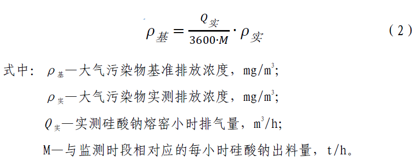 六、增加4.2.8 條,內(nèi)容為:純氧燃燒硅酸鈉熔窯應(yīng)監(jiān)測(cè)排氣筒中大氣污染物排放濃度、排氣量及相應(yīng)時(shí)間內(nèi)的硅酸鈉出料量,按式(2)換算為基準(zhǔn)排氣量(3600 m3/t 硅酸鈉)條件下的大氣污染物基準(zhǔn)排放濃度,并以此作為達(dá)標(biāo)判定依據(jù)。大氣污染物排放濃度、排氣量、產(chǎn)品產(chǎn)量的監(jiān)測(cè)、統(tǒng)計(jì)周期為1 h,可連續(xù)采樣或等時(shí)間間隔采樣獲得大氣污染物排放濃度和排氣量數(shù)據(jù),硅酸鈉出料量數(shù)據(jù)以企業(yè)統(tǒng)計(jì)報(bào)表為依據(jù)。